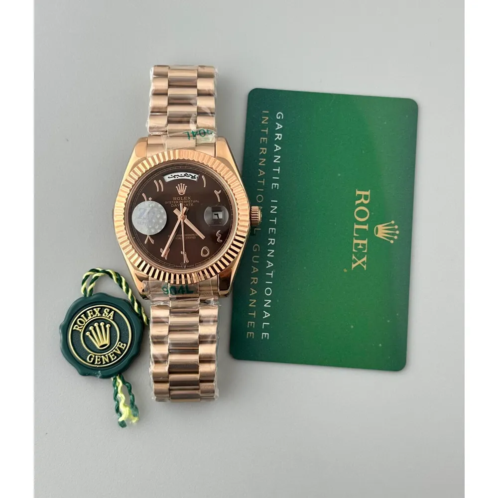 The Rolex Day-Date 40 Arabic Dial Watch is a luxurious timepiece that combines sophistication, functionality, and cultural elegance. Crafted from 40mm rose gold stainless steel, this watch features a polished bezel that perfectly frames the deep brown dial, giving it a refined and premium appearance. The dial is adorned with Arabic numerals, adding a unique cultural touch, while the day and date functions provide practical timekeeping for daily use. This combination of aesthetics and functionality makes the watch suitable for both formal events and everyday wear, delivering elegance and reliability in every setting.