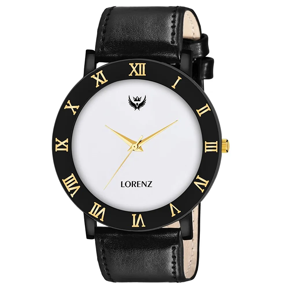 Lorenz Watch Black Leather Strap & White Roman Dial Analogue Watch for Men